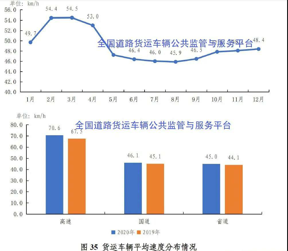 2020年,我国货运车辆年平均速度为49km/h,较去年提升3%。其中高速公路平均速度70.6km/h,国道平均速度46.1km/h,省道平均速度为45km/h,不同道路结构车辆行驶速度均有小幅提升,其中高速平均行驶速度较去年提升4.6%,但与美国相比(2015年平均速度为88.5 km/h),仍有待提升。